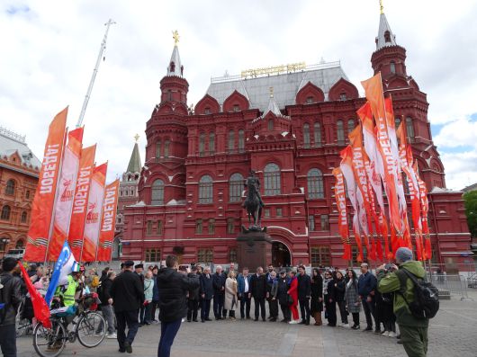 6일(현지시간) 러시아 모스크바 붉은광장 인근 주코프 장군 동상 앞에서 제2차 세계대전 승리 기념일(전승절) 80주년 장식을 배경으로 러시아인들이 기념 촬영하고 있다. 연합뉴스 |
