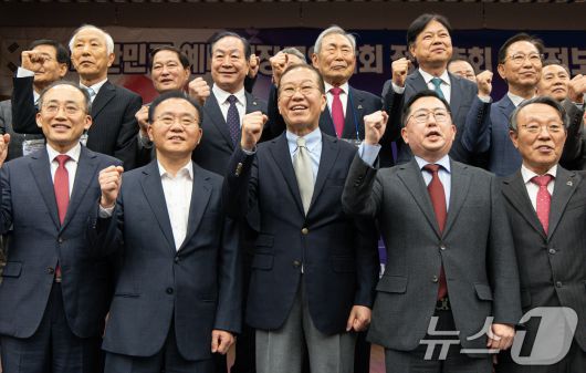 (서울=뉴스1) 이재명 기자 = 권영세 국민의힘 비상대책위원장이 7일 오후 서울 여의도 국회 의원회관에서 열린 트럼프시대 국가안전보장 대토론회에서 참석내빈들과 기념촬영을 하고 있다. 2025.5.7/뉴스12expulsion@news1.krCopyright ⓒ 뉴스1. All rights reserved. 무단 전재 및 재배포, AI학습 이용 금지.