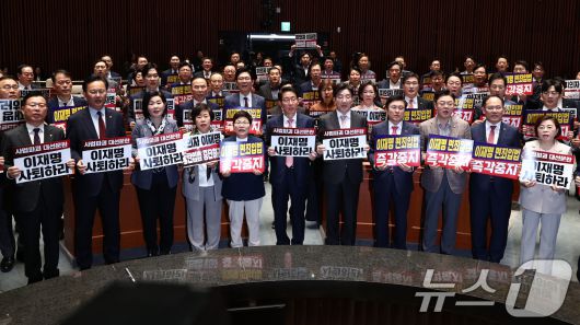 (서울=뉴스1) 김민지 기자 = 국민의힘 권성동 원내대표를 비롯한 의원들이 7일 오후 서울 여의도 국회에서 열린 의원총회에서 형사소송법 개정안과 공직선거법 개정안 강행 처리를 시도하는 더불어민주당을 규탄하는 손피켓을 들고 구호를 외치고 있다. 2025.5.7/뉴스1
