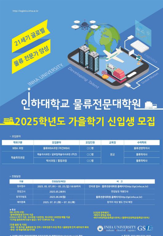 인하대학교(총장 조명우) 물류전문대학원이 2025학년도 가을학기 신입생을 모집한다.
