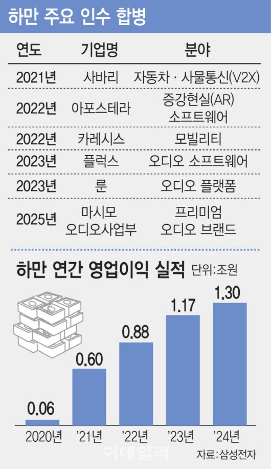 [이데일리 조민정 기자] 삼성전자 자회사 하만이 초럭셔리 오디오 브랜드들을 보유한 미국 마시모의 오디오사업부를 인수했다. 9조원을 투자한 하만 인수 후 8년 만에 단행한 대규모 인수합병(M&A)이다. 삼성은 이번 M&A를 통해 하만의 홈오디오와 카오디오 사업을 동시에 강화한다는 방침이다. 최근 영업이익 증가세를 보이는 하만이 M&A까지 추진하면서 그룹 내 새로운 ‘캐시카우’로 떠오를지 주목된다.