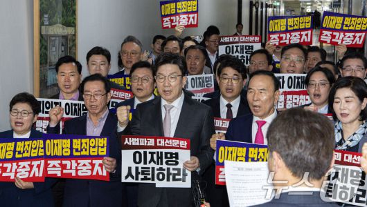 (서울=뉴스1) 이재명 기자 = 권성동 국민의힘 원내대표를 비롯한 의원들이 7일 오후 서울 여의도 국회 법제사법위원회 전체회의장 앞에서 '대통령 당선시 재판 정지법' 상정 규탄을 하고 있다. 2025.5.7/뉴스12expulsion@news1.krCopyright ⓒ 뉴스1. All rights reserved. 무단 전재 및 재배포, AI학습 이용 금지.