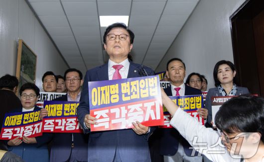 (서울=뉴스1) 이재명 기자 = 박형수 국민의힘 원내수석부대표가 7일 오후 서울 여의도 국회 법제사법위원회 전체회의장 앞에서 '대통령 당선시 재판 정지법' 상정 규탄 발언을 하고 있다. 2025.5.7/뉴스1