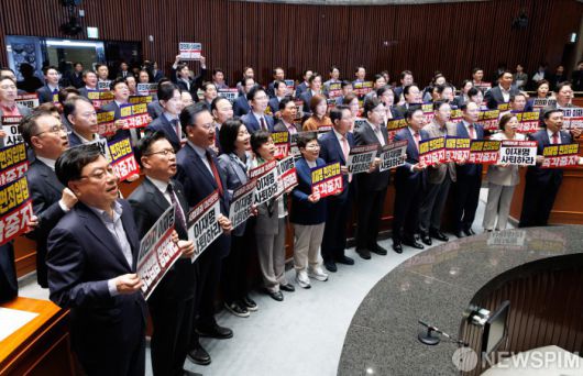 [서울=뉴스핌] 윤창빈 기자 = 권성동 국민의힘 원내대표와 당직자들이 7일 오후 서울 여의도 국회에서 열린 의원총회에서 피켓을 들고 구호를 외치고 있다. 2025.05.07 pangbin@newspim.com |