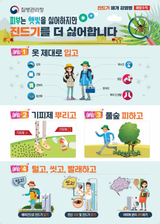 군 보건소는 주민들에게 ▲풀밭에 눕거나 앉지 않기 ▲피부 노출 최소화(토시, 장갑, 모자 착용) ▲야외활동 후 세탁과 목욕 철저 등을 당부하고 있다.