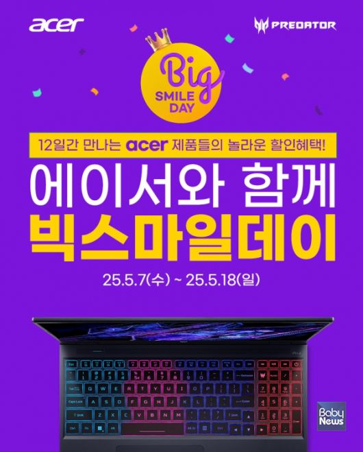 글로벌 PC제조사 에이서(Acer)가 오는 5월 18일까지 진행하는 G마켓과 옥션의 연중 최대 쇼핑 축제인 '빅스마일데이’에서 자사의 인기 노트북 13종을 최대 47% 할인된 가격에 판매한다고 7일 밝혔다.