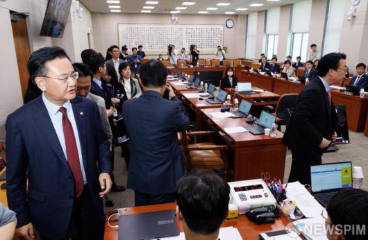 [서울=뉴스핌] 윤창빈 기자 = 유상범 국회 법제사법위원회 국민의힘 간사를 비롯한 소속 의원들이 7일 오후 서울 여의도 국회에서 열린 법제사법위원회 전체회의에서 조희대 대법원장 등 사법부의 대선개입 의혹 진상규명 청문회 실시계획서 채택의 건 표결에 반대하며 회의장을 나서고 있다. 2025.05.07 pangbin@newspim.com