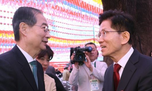 김문수 국민의힘 대통령 후보(오른쪽)와 한덕수 무소속 대통령 후보가 5일 서울 종로구 조계사에서 열린 불기 2569년 부처님오신날 봉축법요식을 마친 뒤 악수하고 있다. 대통령실사진기자단 |