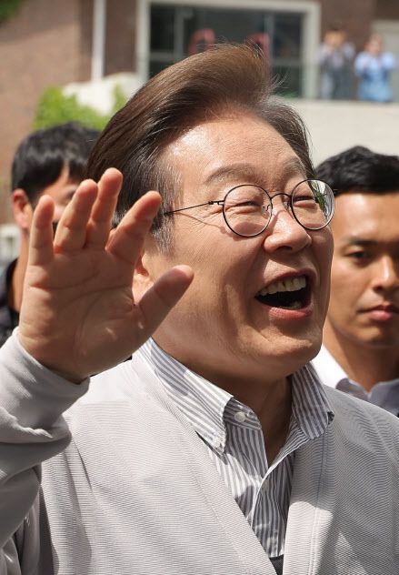 더불어민주당 이재명 대선 후보가 ‘골목골목 경청투어:국토종주편’에 나선 7일 전북 전주시 풍남문 앞 광장 인근에서 지지자 및 시민들에게 밝게 인사하고 있다. (사진=연합뉴스) |