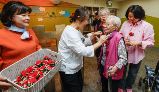 어버이날을 하루 앞둔 7일 서울 동작구 대방종합사회복지관에서 어르신들에게 카네이션을 달아드리고 축하 공연을 하는 행사를 열었다.