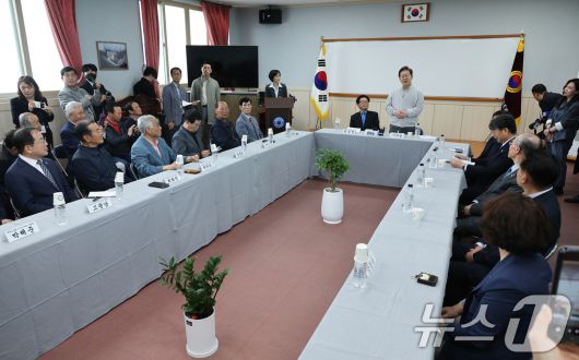 (익산=뉴스1) 안은나 기자 = 이재명 더불어민주당 대통령 후보가 2차 골목골목 경청투어 마지막 날인 7일 오후 전북 익산시 대한노인회 익산지회에서 열린 임원과의 간담회에 참석해 인사말을 하고 있다. 2025.5.7/뉴스1