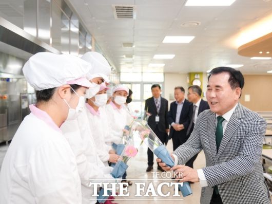 김지철 교육감을 비롯한 충남도교육청 간부공무원들은 이날 아산갈산중학교를 찾아 급식 관계자의 노고에 대해 격려하고 함께 작은 꽃다발을 증정하며 고마운 마음을 전했다.