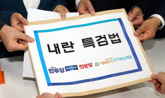 김용민 더불어민주당 원내정책수석부대표, 정춘생 조국혁신당 원내수석부대표, 한창민 사회민주당 대표, 정진욱 민주당 의원이 지난달 25일 오후 국회 의안과에 ‘내란 특검법’을 제출하고 있다. 공동취재사진 |