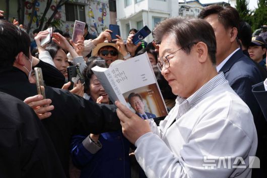 [전주=뉴시스] 조성봉 기자 = 민심을 청취하는 '경청 투어'에 나선 이재명 더불어민주당 대선후보가 7일 전북 전주시 완산구 풍남문 인근에서 시민들에게 사인을 해주고 있다. 2025.05.07. suncho21@newsis.com |