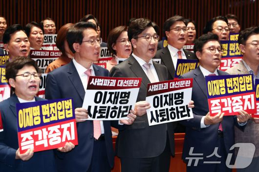 (서울=뉴스1) 김민지 기자 = 국민의힘 권성동 원내대표를 비롯한 의원들이 7일 오후 서울 여의도 국회에서 열린 의원총회에서 형사소송법 개정안과 공직선거법 개정안 강행 처리를 시도하는 더불어민주당을 규탄하는 손피켓을 들고 구호를 외치고 있다. 2025.5.7/뉴스1