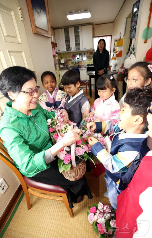 (광주=뉴스1) 박지현 기자 = 어버이날을 하루 앞둔 7일 광주 북구 중흥동 행정복지센터 직원과 중흥하나어린이집 아이들이 지역 돌봄어르신 세대를 방문해 카네이션을 전달하고 포옹으로 헤어짐의 아쉬운 작별인사를 나누고 있다.(광주 북구 제공 재판매 및 DB 금지) 2025.5.7/뉴스1