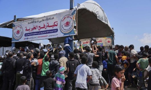 팔레스타인 사람들이 5일(현지시각) 가자지구 칸 유니스의 한 무료급식소에서 제공하는 음식을 받기 위해 경쟁하고 있다. 칸유니스/AP 연합뉴스 |