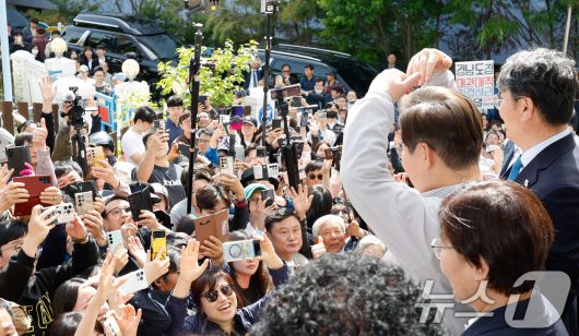 (익산=뉴스1) 안은나 기자 = 이재명 더불어민주당 대통령 후보가 2차 골목골목 경청투어 마지막 날인 7일 오후 전북 익산시 대한노인회 익산지회에서 간담회에 참석하기 전 시민들을 향해 인사하고 있다. 2025.5.7/뉴스1