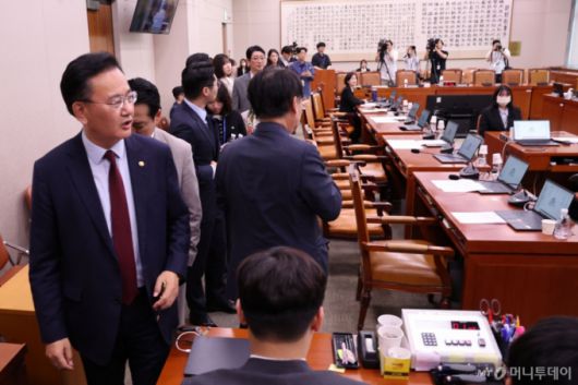 [서울=뉴시스] 권창회 기자 =7일 서울 여의도 국회에서 열린 법제사법위원회 전체회의에서 유상범 국민의힘 간사를 비롯한 국민의힘 의원들이 조희대 대법원장 청문계획서 의결에 반발하며 퇴장하고 있다. 2025.05.07. kch0523@newsis.com /사진=권창회 |