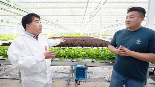 NH농협은행 농업공공금융부문 백남성 부행장(왼쪽)과 한상태 H&A 대표(오른쪽)가 스마트팜 설비 앞에서 농업 금융 지원 방안에 대해 이야기를 나누고 있다. 삼성전자에서 14년 간 근무했던 한 대표는 공학 지식을 바탕으로 샐러드 채소를 자동 재배하는 스마트팜 설비를 구축했다. 한씨는 NH농협은행의 농업금융컨설팅을 바탕으로 50억원의 ‘스마트팜종합자금대출’을 받아 스마트팜 구축 자금으로 활용했다. NH농협은행 |