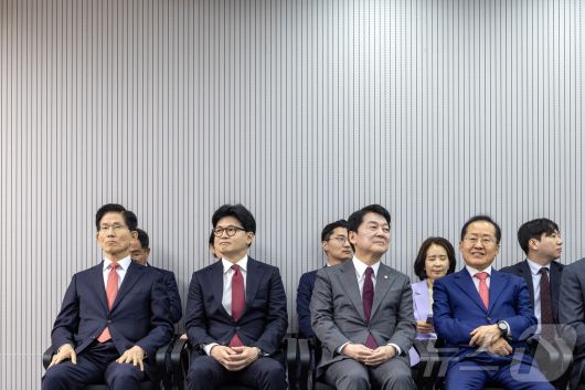 제21대 대통령후보자 국민의힘 3차 경선 진출자를 발표하는 29일 오후 서울 여의도 국민의힘 중앙당사에서 김문수, 한동훈, 안철수, 홍준표 후보가 결과를 기다리고 있다. 2025.4.29/뉴스1 ⓒ News1 국회사진취재단 |