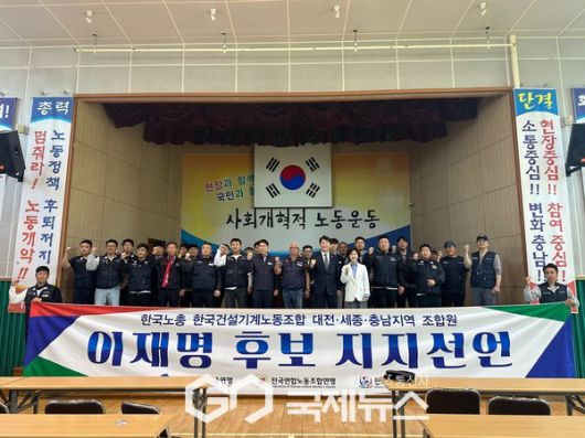 한국노총 한국건설기계노동조합 대전.세종.충남 조합원 일동이 더불어민주당 소속 이재명 대통령 후보를 지지하고 나섰다.(사진/국제뉴스 이원철 기자 ) |
