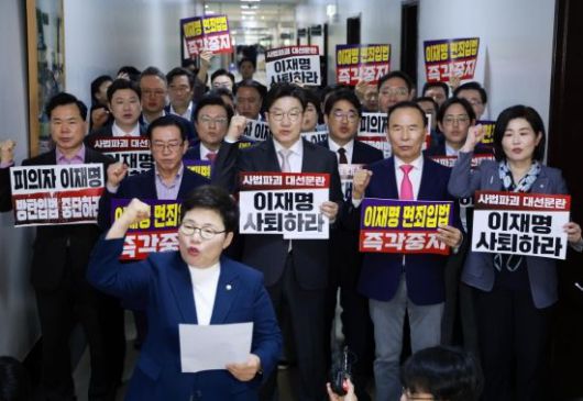 국민의힘 의원들이 7일 국회 법제사법위원회 전체회의장 앞에서 ‘이재명 면죄입법 즉각중지’ 등의 내용이 적힌 손팻말을 들고 구호를 외치고 있다. <ⓒ투자가를 위한 경제콘텐츠 플랫폼, 아시아경제(www.asiae.co.kr) 무단전재 배포금지>