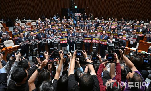 아시아투데이 송의주 기자 = 권성동 국민의힘 원내대표와 의원들이 7일 국회에서 열린 의원총회에서 형사소송법 개정안과 공직선거법 개정안 강행 처리를 시도하는 더불어민주당을 규탄하는 손피켓을 들고 구호를 외치고 있다. ⓒ "젊은 파워, 모바일 넘버원 아시아투데이"