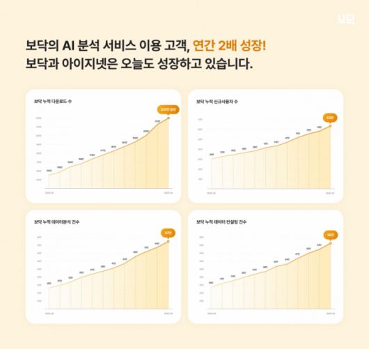 이번에 공개된 자료에 따르면, 보닥은 △월 신규 사용자 수 △데이터 분석 건수 △컨설팅 건수 등 주요 지표에서 전년 동기 대비 약 100% 성장한 것으로 나타났다.