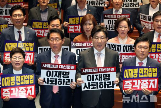 서지영 원내대변인은 논평에서 "(민주당이 강행 처리한) 법안들은 대법원에서 유죄 취지 판결을 받은 이재명 단 한 사람만을 위한 '맞춤형 면죄부' 법안으로, 결국 그 첫 번째 수혜자, 즉 '법 위에 군림'할 '이재명 1인 체제'를 만들자는 것"이라고 지적했다.