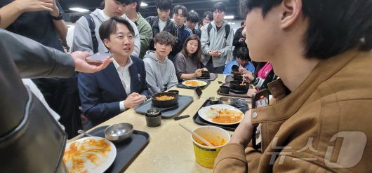 (대전=뉴스1) 김종서 기자 = 이준석 개혁신당 대선 후보가 7일 대전 유성구 충남대학교 학생식당을 찾아 학생들과 함께 점심을 먹으며 이야기를 나누고 있다. ⓒ 뉴스1 2025.5.7/뉴스1jongseo12@news1.krCopyright ⓒ 뉴스1. All rights reserved. 무단 전재 및 재배포, AI학습 이용 금지.