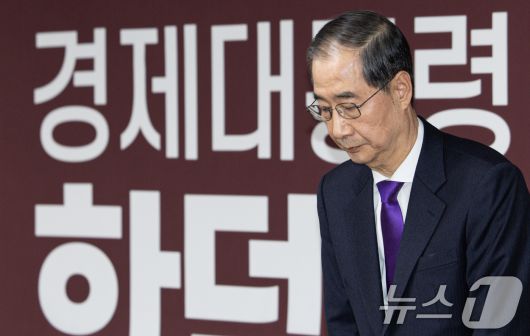 (서울=뉴스1) 이재명 기자 = 한덕수 무소속 대선 예비후보가 7일 서울 여의도 맨하탄21빌딩에 마련된 선거 사무소에서 긴급 입장 발표를 마친 후 인사하고 있다. 2025.5.7/뉴스12expulsion@news1.krCopyright ⓒ 뉴스1. All rights reserved. 무단 전재 및 재배포, AI학습 이용 금지.