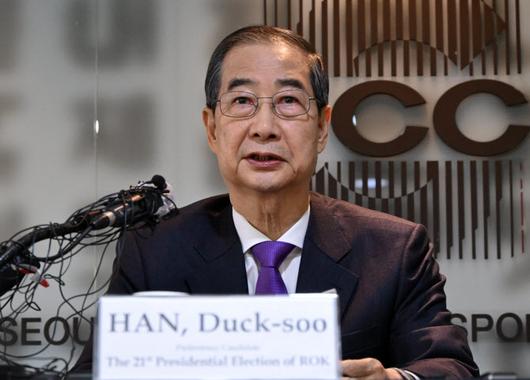 7일 서울 중구 한국프레스센터에서 열린 서울외신기자클럽 초청 기자간담회에서 한덕수 무소속 대통령 선거 예비후보가 발언하고 있다.(사진=연합뉴스) |