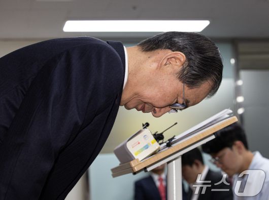 (서울=뉴스1) 이재명 기자 = 한덕수 무소속 대선 예비후보가 7일 서울 여의도 맨하탄21빌딩에 마련된 선거 사무소에서 긴급 입장 발표에 앞서 인사하고 있다. 2025.5.7/뉴스12expulsion@news1.krCopyright ⓒ 뉴스1. All rights reserved. 무단 전재 및 재배포, AI학습 이용 금지.