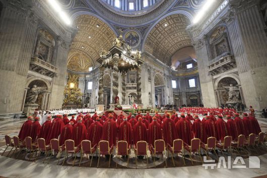 [바티칸시티=AP/뉴시스] 교황청은 5일(현지 시간) 차기 교황을 뽑는 콘클라베에 참석하는 추기경 선거인단 133명 전원이 바티칸에 도착했다고 밝혔다. 사진은 지난달 30일 바티칸의 성 베드로 대성당에서 프란치스코 교황의 추모 미사에 참석한 추기경들의 모습. 2025.05.06 |