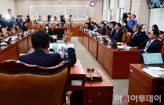 아시아투데이 이병화 기자 = 정청래 국회 법제사법위원장과 더불어민주당 의원들이 7일 국회에서 열린 법제사법위원회 전체회의에서 조희대 대법원장 등 사법부의 대선개입 의혹 진상규명 청문회 실시계획서 채택의 건에 대한 표결을 하고 있다. 이날 국민의힘 의원들은 표결에 반발하며 퇴장했다. ⓒ "젊은 파워, 모바일 넘버원 아시아투데이"