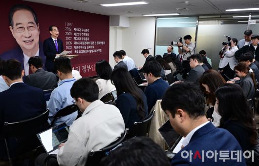 아시아투데이 이병화 기자 = 한덕수 무소속 대선 예비후보가 7일 서울 여의도 맨하탄21빌딩에 마련된 선거 사무소에서 긴급 입장 발표를 하고 있다.