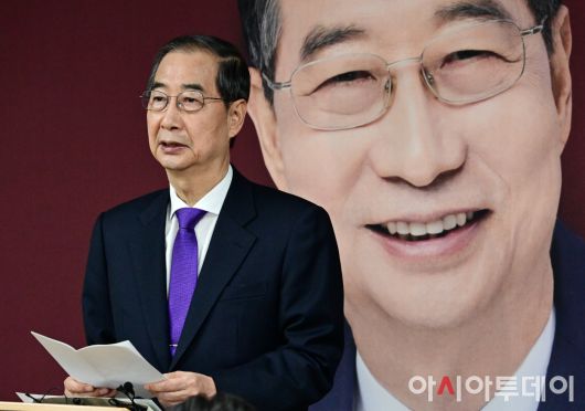 아시아투데이 이병화 기자 = 한덕수 무소속 대선 예비후보가 7일 서울 여의도 맨하탄21빌딩에 마련된 선거 사무소에서 긴급 입장 발표를 하고 있다. ⓒ "젊은 파워, 모바일 넘버원 아시아투데이"