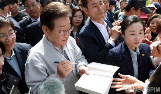 [익산=뉴스핌] 정일구 기자 = 골목골목 경청투어에 나선 이재명 더불어민주당 대선 후보가 7일 오후 전북 익산시 대한노인회 익산시지회에서 열린 노인회 임원과의 간담회에 참석하며 지지자가 건넨 자서전에 사인을 하고 있다. 2025.05.07 mironj19@newspim.com