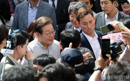 [익산=뉴스핌] 정일구 기자 = 골목골목 경청투어에 나선 이재명 더불어민주당 대선 후보가 7일 오후 전북 익산시 대한노인회 익산시지회에서 열린 노인회 임원과의 간담회에 참석하며 지지자들과 인사를 나누고 있다. 2025.05.07 mironj19@newspim.com