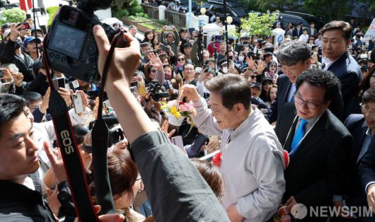 [익산=뉴스핌] 정일구 기자 = 골목골목 경청투어에 나선 이재명 더불어민주당 대선 후보가 7일 오후 전북 익산시 대한노인회 익산시지회에서 열린 노인회 임원과의 간담회에 참석하며 선물받은 카네이션 화분을 들어보이고 있다. 2025.05.07 mironj19@newspim.com |