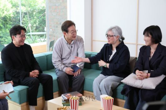 이재명 더불어민주당 대선 후보가 7일 전북 전주시 한옥마을 내 한 카페에서 ‘영화와 드라마, 정치가 그리는 미래의 스크린’이라는 주제로 윤제균 영화감독, 김은숙 드라마 작가 등 문화예술 분야 관계자들과 ‘K-콘텐츠 산업 진흥 간담회’를 열고 있다. 전주 안주영 전문기자 |