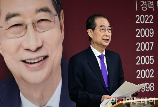 아시아투데이 이병화 기자 = 한덕수 무소속 대선 예비후보가 7일 서울 여의도 맨하탄21빌딩에 마련된 선거 사무소에서 긴급 입장 발표를 하고 있다.