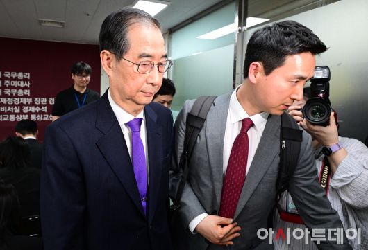 아시아투데이 이병화 기자 = 한덕수 무소속 대선 예비후보가 7일 서울 여의도 맨하탄21빌딩에 마련된 선거 사무소에서 긴급 입장 발표를 마친 뒤 회견장을 나서고 있다.