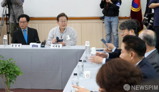 [익산=뉴스핌] 정일구 기자 = 골목골목 경청투어에 나선 이재명 더불어민주당 대선 후보가 7일 오후 전북 익산시 대한노인회 익산시지회에서 노인회 임원들과 간담회를 갖고 있다. 2025.05.07 mironj19@newspim.com