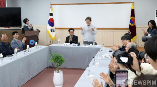 [익산=뉴스핌] 정일구 기자 = 골목골목 경청투어에 나선 이재명 더불어민주당 대선 후보가 7일 오후 전북 익산시 대한노인회 익산시지회에서 열린 노인회 임원과의 간담회에서 인사말을 하고 있다. 2025.05.07 mironj19@newspim.com
