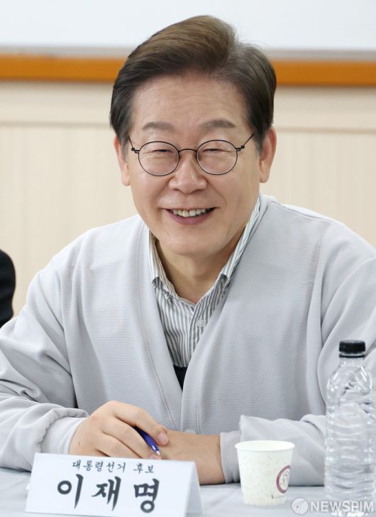 [익산=뉴스핌] 정일구 기자 = 골목골목 경청투어에 나선 이재명 더불어민주당 대선 후보가 7일 오후 전북 익산시 대한노인회 익산시지회에서 열린 노인회 임원과의 간담회에서 미소 짓고 있다. 2025.05.07 mironj19@newspim.com