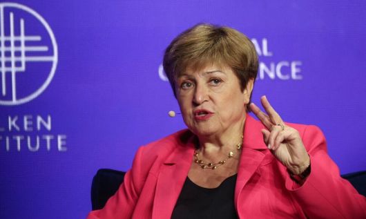 크리스탈리나 게오르기에바 IMF 총재가 5일(현지시각) 미국 캘리포니아 비벌리힐스에서 열린 ‘밀컨 글로벌 콘퍼런스’에서 발언하고 있다. AFP 연합뉴스 |