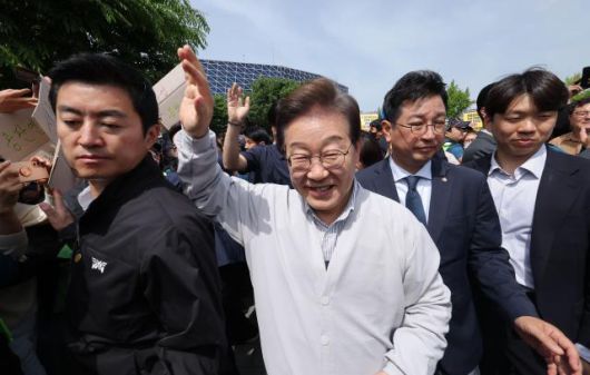 더불어민주당 이재명 대선 후보가 '골목골목 경청투어:국토종주편'에 나선 7일 전북 전주시 풍남문 앞 광장에서 지지자 및 시민들에게 인사를 하고 있다. [사진=연합뉴스] |
