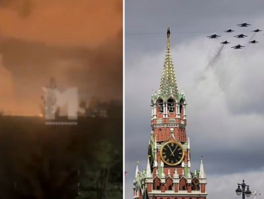 왼쪽은 현지시간으로 6일 새벽 우크라이나군이 러시아 수도 모스크바를 향해 대규모 드론 공습을 가하면서 화재가 발생한 모습, 오른쪽은 지난 5일 전승절 기념 군사 퍼레이드 훈련이 진행된 모스크바의 모습. AP 연합뉴스 |